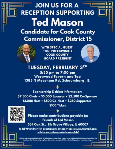 Join Ted Mason for a reception in support of his campaign for Cook County Commissioner on Tuesday, February 3, from 5:30–7:00 p.m.