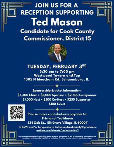 Join Ted Mason for a reception in support of his campaign for Cook County Commissioner on Tuesday, February 3, from 5:30–7:00 p.m.